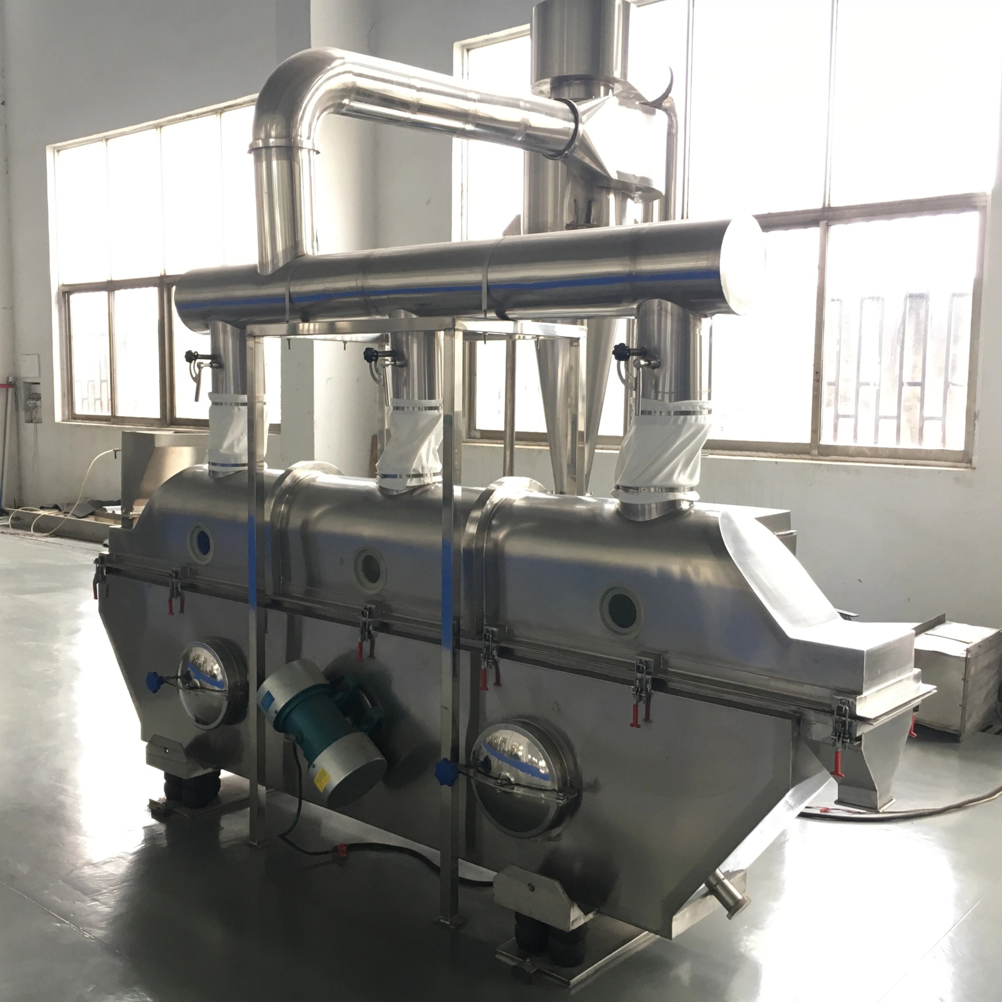 Материал входит в машину от питаясь порта. Под действием силы вибрации, материал брошен в горизонтальное направление и двигает вперед непрерывно. Флюидизированные пропуски горячего воздуха через - кровать и жара обменами с влажным материалом. Разрядка, сухой материал discharged от выгрузочного отверстия.