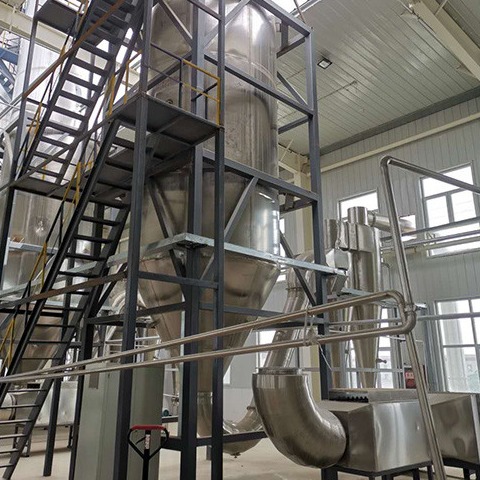 Сырье жидкости или затира распылено в небольшое жидкостное падение отжатой помощью притяжки спрейера от давления насоса diaphram, и быстро сушить через amply теплообмен (10-90sec.). Большее часть из зерен порошка собрана от выхода разрядки на дне сушильщика. Расточительствованные воздух и тонкоизмельченный порошок отделены циклоном, расточительствованный воздух вытыхание от вентилятора проекта, и тонкоизмельченный порошок собран на дне циклона. Вторая сыпня ранга оборудованная на выходе; поэтому, скорость восстановления законченного зерна порошка может быть 96% до 98%.