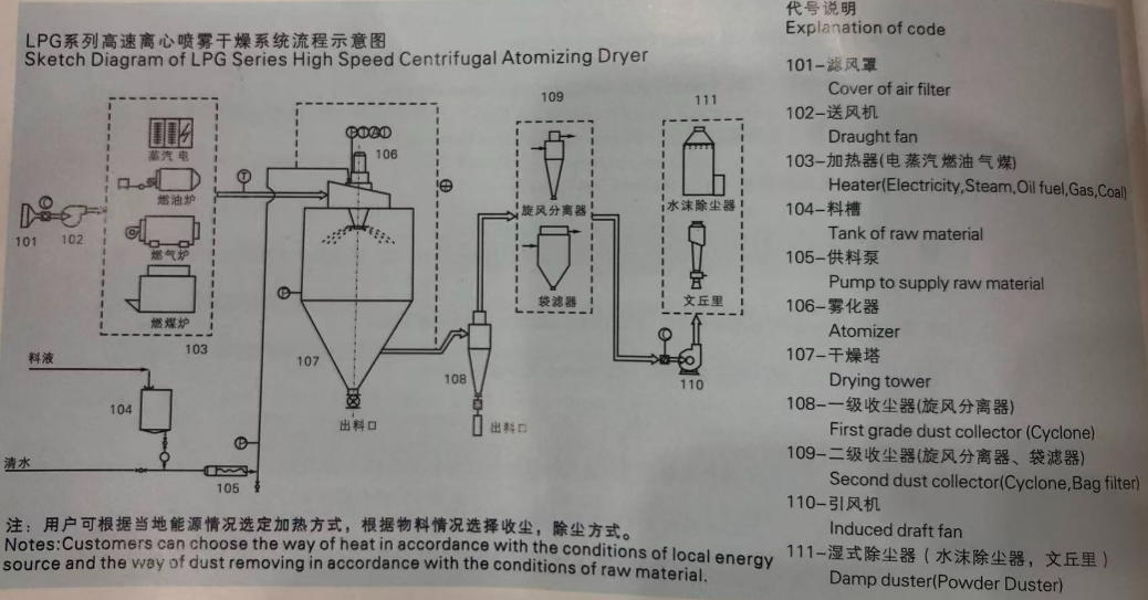 After filtering and heating, the hot fresh air enter into the air distributor at the top of drying chamber, distributed in spiral way uniformly from up to down. At the same time, the feeding liquid is pumped to the top atomizer, then be sprayed to extremely fine mist liquid drop. Through the short time of direct contact with hot air, the moisture evaporated at once, the solid remains to be powder. The dry powder will be discharged continuously from the bottom of drying tower and cyclone collector, the exhaust air will be discharged after cleaning.
